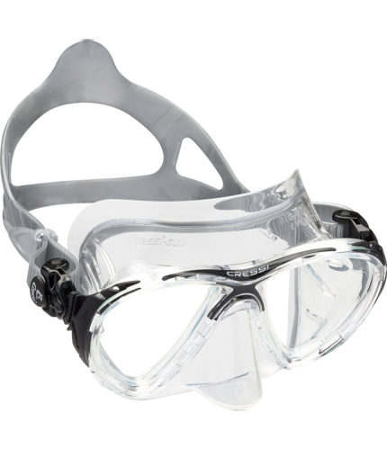 Not only has this new Cressi Crystal Silicone been chosen, with its exceptional softness and comfort, but the entire design of the skirt has followed new rules which allow a point of contact between the mask and the face that has a very open angle. The mask rests on the face with unprecedented comfort and does not leave any marks on the skin, even after extended use. Naturally, to obtain such a result the entire structure of the skirt is differentiated, with internal ribs that stiffen the parts of the mask that are most stressed. The raked lenses(Cressi patent), are quite small and are brought as close to the pupils as possible, so that the already extraordinary visibility of the Matrix is increased by 25%. The headband uses the exclusive patented Cressi system of double injection of an elastomer on a rigid element and allows the buckles of the strap to be mounted not on the skirt structure, as done by our competitors, but on an indestructible elastic element that tilts on a vertical plane and can be completely bent sideways on a 180° curve. The thickness of the headband has been reduced to such an extent as to make it practically invisible when the mask is being worn.